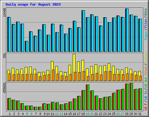 | Day | Hits | Files | Pages | Visits | Sites | kB F | kB In | kB Out | ||||||||